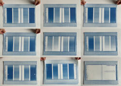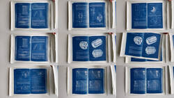 Neben den großen Tafeln sind die ungebundenen Bögen zweier auf Anna Atkins verweisende Künstlerbücher ausgestellt: Eines zeigt technische Zeichnungen in der Art historischer Blaupausen, das andere verwandelt ein Spektrum von 2500 Farben auf Blauabstufungen.