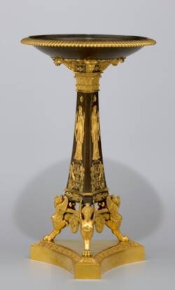 Bei diesem bronzenen Tafelaufsatz handelt es sich um eine sogenannte Athénienne. Sie erfreute sich insbesondere im französischen Klassizismus großer Beliebtheit und zierte – oft paarweise – fürstliche Tafeln. Die Schale mit ihrer vergoldeten Eierstabkante diente dabei wahlweise zur Aufbewahrung von Räucherware oder von Flüssigkeiten.
