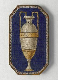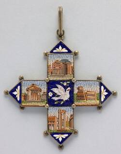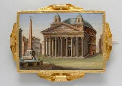 Auch wenn die vatikanische Produktion gut dokumentiert ist und einige Künstler hervortreten, ist die Autorschaft bei der Bewertung von Mikromosaiken nur selten ausschlaggebend. Auch Datierungen sind in den allermeisten Fällen nur schätzungsweise möglich. Was zählt, ist die Feinheit der Ausführung und die Komplexität des Motivs. Es darf als wenig überraschend gelten, dass die beliebtesten touristischen Destinationen auch die verbreitetsten Motive für Mikromosaike sind. Die zwei golden gerahmten Broschen stellen beispielsweise den großen Wasserfall von Tivoli – spätestens seit Goethes Italienreise ein beliebtes Ausflugsziel – und das Pantheon dar, das am vollständigsten erhaltene antike Bauwerk in Rom. Der kreuzförmige Anhänger zeigt – zusätzlich zum Pantheon – drei weitere bedeutende antike Stätten: den Tempel des Hercules Victor, das Forum Romanum sowie das Kolosseum. Bei den beiden Objekten mit Amphoren handelt es sich um Schmuckplättchen für Ringe: direkte Vergleichsbeispiele werden am Victoria & Albert Museum bewahrt.