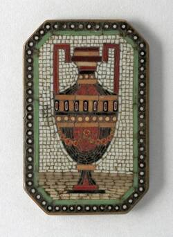 Der Begriff ‚Mikromosaik‘, der zur Beschreibung der hier ausgestellten Schmuckstücke geeignet ist, wurde durch den bedeutenden englischen Sammler Sir Arthur Gilbert (1913-2001) geprägt. Im Laufe seines langen Lebens gelang es ihm, die mit Abstand bedeutendste Sammlung derartiger Objekte weltweit aufzubauen. Nach ihm und seiner Frau Rosalind benannt, wird sie heute am Victoria & Albert Museum in London aufbewahrt. Sie bietet zahlreiche Parallelen zu den hier dargestellten Motiven.