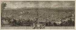 Das riesige Stadtpanorama von Giuseppe Vasi aus dem Jahr 1765, feiert die Verbindung von Vergangenheit und Gegenwart in Rom, zeigt die archäologischen Stätten und vielen Kirchen ebenso wie die nahe gelegenen Städte, allesamt Reiseziele auf der Grand Tour.