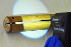 Zunächst wurde beim Eintreffen des Instruments in Sachsen eine Beschädigung diagnostiziert – offenbar hatten Luftdruck- oder Temperaturschwankungen im Frachtraum des Flugzeugs auf dem Weg nach Europa das Material derart strapaziert, dass am Bambusrohr ein Riss über die gesamte Länge auftrat und das Instrument damit unbenutzbar machte. Unsere Restaurierungsabteilung muss nun ermitteln, ob sich der Originalzustand des Objekts mittels Reparatur wiederherstellen lässt, oder ob der Schaden lediglich kaschiert werden kann.