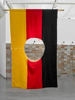 Der Konzeptkünstler Georg Herold – nach einem gescheiterten Fluchtversuch aus der DDR 1973 durch die Bundesrepublik freigekauft – verwendet für seine Werke gewöhnliche Materialen und Alltagsgegenstände. Häufig fordern uns seine Arbeiten dazu auf, darüber nachzudenken, was Kunst ist oder sein kann. In dieser hängenden Stoffskulptur besteht eine absurde Kluft zwischen der Anspielung auf wohlbekannte Nationalfahnen einerseits, Material und Titel andererseits. Dabei verbindet der Künstler seine ernsten Themen – hier die Beschäftigung mit politischen Systemen und ihrer Instabilität sowie mit nationaler Identität und seiner eigenen Biografie – mit Humor und Ironie.