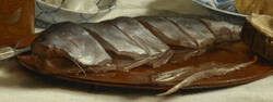 Auf Joseph de Brays Stillleben finden Sie drei gepökelte Heringe. Je einer flankiert rechts und links die Steinkartusche, auf die ein Gedicht geschrieben steht. Ein weiteres fettschimmerndes Exemplar liegt aufgeschnitten auf einem Teller. Daneben stehen auf einem weißen Tischtuch die Beigaben der Mahlzeit: geschälte Zwiebeln in einer kleinen weißblauen Schüssel, dazu ein Delfter Teller mit Butter, Brot sowie Gläser mit hellem und dunklem Bier aus einem Tonkrug.