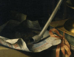Vor einer dunklen Nische ist ein Vorhang beiseite gezogen und Gegenstände treten in Erscheinung: Auf einem mit einer rötlichen Schleife zugebundenen Buch steht ein Kerzenleuchter, dahinter im Schatten, eine hohe Sanduhr. Eine Tonpfeife mit langem Stil lehnt an der Wand. Ihr Pfeifenkopf soll mit dem Tabak gestopft werden, der auf den „Neuesten Nachrichten“ ausgebreitet ist. Von einem Nagel außerhalb der Nische hängt an einem blauen Band eine Uhr und erinnert daran, dass unsere Stunden gezählt sind. Die dargestellten Objekte riefen die Vergänglichkeit des Daseins ins Bewusstsein der Betrachtenden.