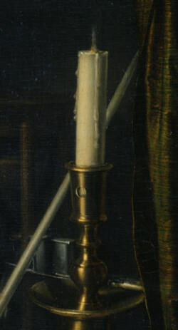 In dieser Darstellung zeigte der Maler sein ganzes Können. Er ließ Zeitungspapier, Schleifenband und Buch vorn wie aus dem Bild herausragen und erreichte mit diesem Kunstgriff den Eindruck der Dreidimensionalität. Die goldene Uhr positionierte er so an der Wand, dass auch der zugezogene Vorhang sie nicht verdecken würde.