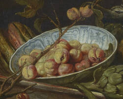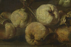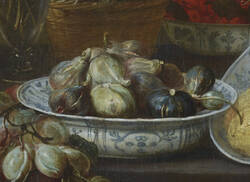 Der flämische Maler Frans Snijders war schon zu Lebzeiten berühmt für seine überbordenden, detailreich gemalten Tafeln. Häufig stellte er importiertes Obst und Gemüse aus dem Mittelmeerraum zusammen mit einheimischem Wild und Tieren aus den Kolonien dar. Mitunter fügte er solchen Darstellungen Figuren – Dienstpersonal oder eine Marktfrau – hinzu. Doch hier rückt er eine reich gewandete Dame ins Bild. Theodor van Thulden hat diese wohl für Snijders gemalt. Sie trägt einen modischen Federschmuck im Haar, und auf ihrer ausgestreckten Rechten sitzt ein in Afrika beheimateter Graupapagei mit roten Schwanzfedern.
