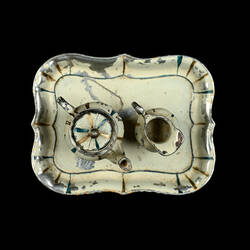 Bemaltes Zinn kennt man eher von Zinnfiguren. In diesem Fall allerdings fanden Material und Technik Verwendung als Ausstattung für eine Puppenstube. In einer solchen Stube ist fast alles so wie im richtigen Leben – nur kleiner. Und so lässt sich auch in diesem Fall vermuten, dass die Kinder, die mit ihrer Puppenstube spielten, mit diesem Service ebenso ihre Gäste bewirteten, wie es ihre Eltern mit deren Besucher*innen taten. Denn das Hantieren der Kinder mit Hausrat und Mobiliar wurde in der Puppenstube ebenso ermöglicht wie das spielerische Einüben von »erwachsenen« Umgangsformen und Routinen.