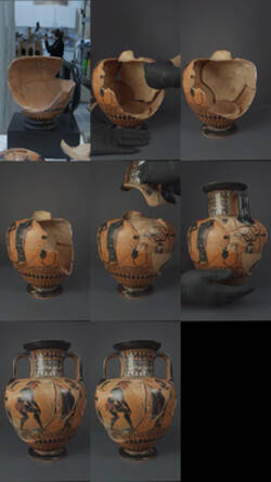 Betrachten Sie nun die Amphora ganz links genauer. Auf einen ersten, oberflächlichen Blick scheint das Gefäß komplett. Doch wenn Sie sich die untenstehende kleine Videosequenz anschauen, können Sie die umfänglichen Ergänzungen eines geschickten Restaurators nachvollziehen.