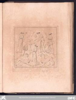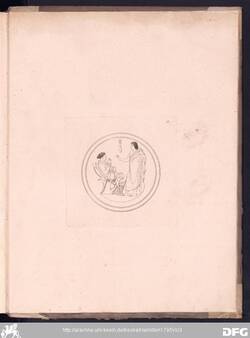 Fällt Ihnen auf, dass die in einen Mantel gehüllte Frau auf dem Lehnstuhl und der Schwan, der sich auf ihrem Schoß niedergelassen hat, mit viel feinerem Pinselstrich gemalt sind? Das liegt daran, dass ebenfalls ein findiger Restaurator, Fälscher oder Verkäufer das Bild erst nachträglich auf den Bauch des antiken Gefäßes aufbrachte, vermutlich, weil es an dieser Stelle beschädigt war und sich sein Verkaufswert mit einer solchen Maßnahme erhöhen ließ. Für seine Komposition, bei der er vielleicht an die Geschichte von Leda und den Schwan dachte, griff er als Vorlage auf Zeichnungen des Malers Johann Heinrich Wilhelm Tischbein zurück. Dieser hatte für die einflussreiche Publikation der zweiten Sammlung des berühmten Vasensammlers Sir William Hamilton Gefäße im Umrisslinienstil gezeichnet.