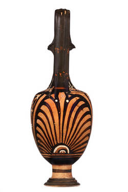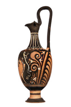 Schauen Sie sich die Bemalung des Gefäßes genauer an. Ursprünglich diente es wohl zum Ausschenken von Wein. Es wurde in der 2. Hälfte des 4. Jhs. v. Chr. in Süditalien, genauer in Apulien, hergestellt. Typisch dafür ist ein reicher Farbauftrag mit weißer und gelber Deckfarbe und eine lockere Malerei, wie sie zum Beispiel auf der nebenstehenden Kanne mit dem geflügelten Pegasos zu erkennen ist.