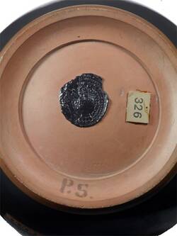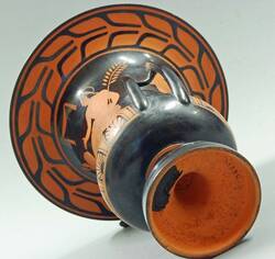 Diese etwas kleinere, bauchige Sonderform der Amphora wird Pelike genannt. Auf der Vorderseite ist eine Mänade, eine Anhängerin des Dionysos zu sehen, wie sie mit einem Thyrsos einen aufdringlichen Satyr in Schach hält. Auf der Unterseite, ein Foto davon befindet sich unten, klebt ein Siegelabdruck in schwarzem Lack mit einem Wappen und der Inschrift [FERDINAN]DO II. RE [DEL] REGNO DELLE DUE SICILIE – COMMESSIONE DI [ANTICHITA] E BELLE ARTI. Hierbei handelt es sich um ein Ausfuhrsiegel Ferdinand II. König beider Sizilien (1830-1859) und die Kommission für das Altertum und die schönen Künste bestätigen damit die Erlaubnis zur Ausfuhr.