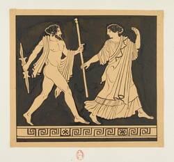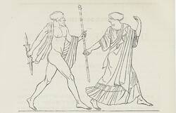 Außerdem spielen Fragen zur antiken Mythologie eine wachsende Rolle, wie auch der 1862 publizierte Artikel von Baron Jean-Joseph-Antoine-Marie de Witte (1808-1889), einem belgischen Archäologen, der sich um eine Deutung dieses Vasenbildes bemühte. Er glaubte letztlich Jupiter und Semele darin zu erkennen, da das prominente Blitzbündel in der Hand des Gottes auf den Tod der Geliebten zu verweisen schien. Seine Beobachtungen stellte er anhand der Zeichnung des Vasenbildes an, die, wie er einleitend schrieb, vor etwa fünfzehn Jahren in Neapel beim Antiquitätenhändler Barone angefertigt wurde. Sie sehen diese untenstehend. Die Bekanntmachung der Vasenbilder in den einschlägigen Publikationen sind besonders für die kunstmythologischen Forschungen des 19. Jahrhunderts von enormer Relevanz.
