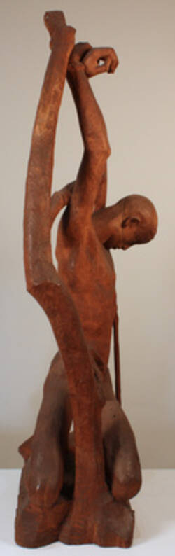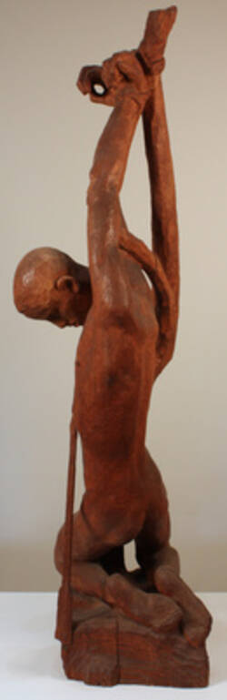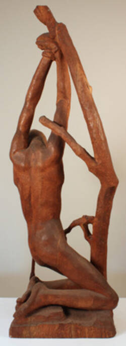 Karl Albiker's depiction of Sebastian, which stands before you, has little in common with the classic martyr. We see a broken figure, emaciated and collapsed. There’s hardly any trace of the grandeur typically promised by Sebastian. Even the tree to which he is bound looks pitiful and withered. His head does not look up in prayer or desire but hangs exhausted.