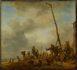 Klar ist allerdings, dass er sich für die Figuren der Eltern von einem Alten Meister inspirieren ließ. Weiter rechts auf Philips Wouwermans Gemälde Fischer am Strand sehen Sie in der Mitte ein eng beieinanderstehendes Paar. Durch Friedrichs Skizzenblätter wissen wir, dass dies die Keimzelle für das Paar am Friedhofstor ist.