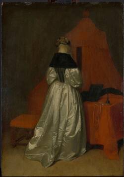 Auch die Idee zur Frau am Fenster dürfte Friedrich bei einem seiner Besuche in der Dresdener Gemäldegalerie gekommen sein. Weiter rechts sehen Sie das Bild, von dem er sich hat inspirieren lassen, Gerard ter Borchs „Dame in weißem Atlas“ von 1654: Beide Frauen wenden uns den Rücken zu, beide tragen hochgestecktes Haar und lange Kleider. Allerdings setzt sich Friedrich auch von dem Niederländer ab: Seine Figur blickt nicht ins Dunkel eines Zimmers, sondern aus dem Zimmer hinaus in die helle Landschaft. Und während ter Borch mit höchster Präzision den weiß-glänzenden Atlas wiedergibt, malt Friedrich seinen grünlichen Kleiderstoff so leicht und luftig, dass beinahe die Unterzeichnung durchscheint.