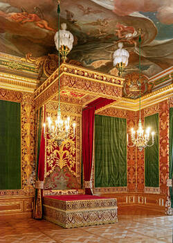 Es ist unschwer zu erkennen: das Bett ist das dominierende Element im Raum. Ein gewaltiges Imperialbett, das ausschließlich für den zeremoniellen Anlass bestimmt war und höchsten repräsentativen Zwecken diente. Es sollte bewundert werden – schlafen tat darin niemand. Die künstlerische Gestaltung des gesamten Paradeschlafzimmers ging von diesem Bett aus.