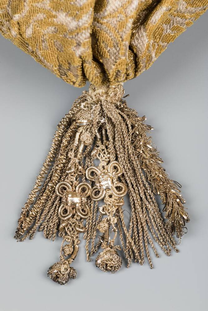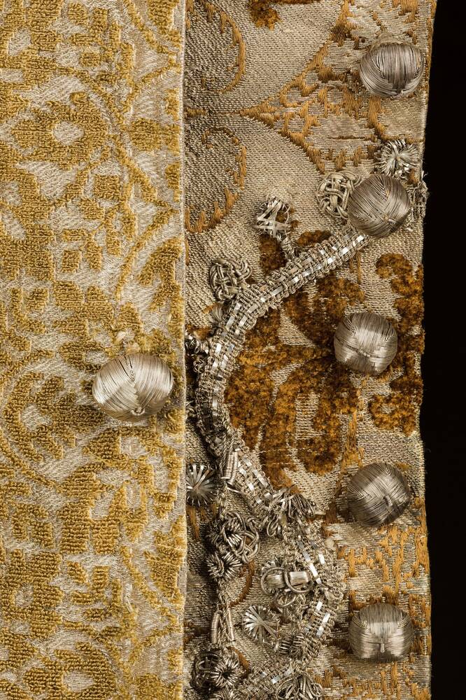 - Oberstoff: Samt unaufgeschnitten, Silberbrokat (Seide, Silberfäden und -gespinste), Leder; Knöpfe: Holz mit Silbergespinst
