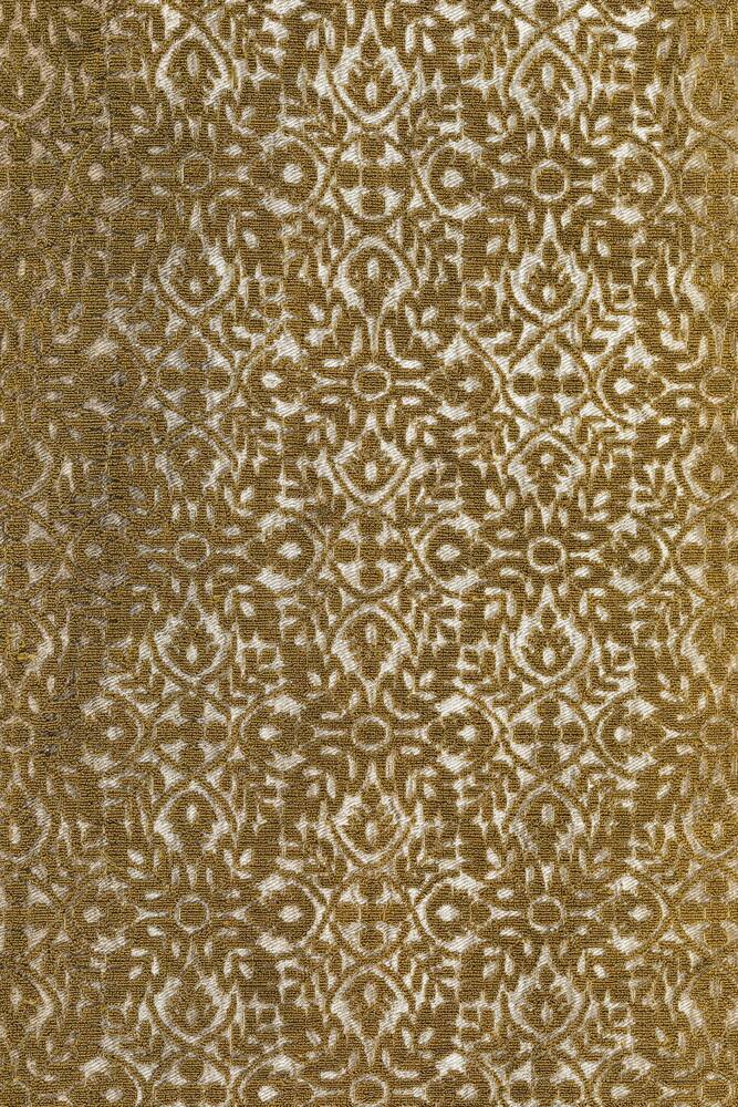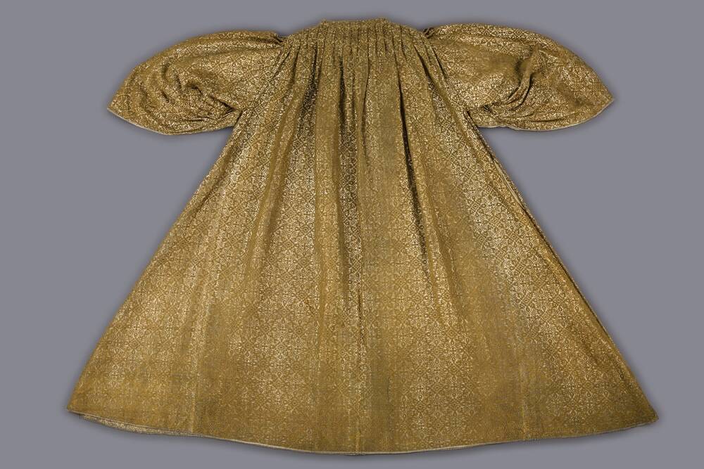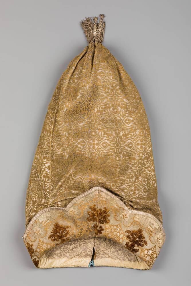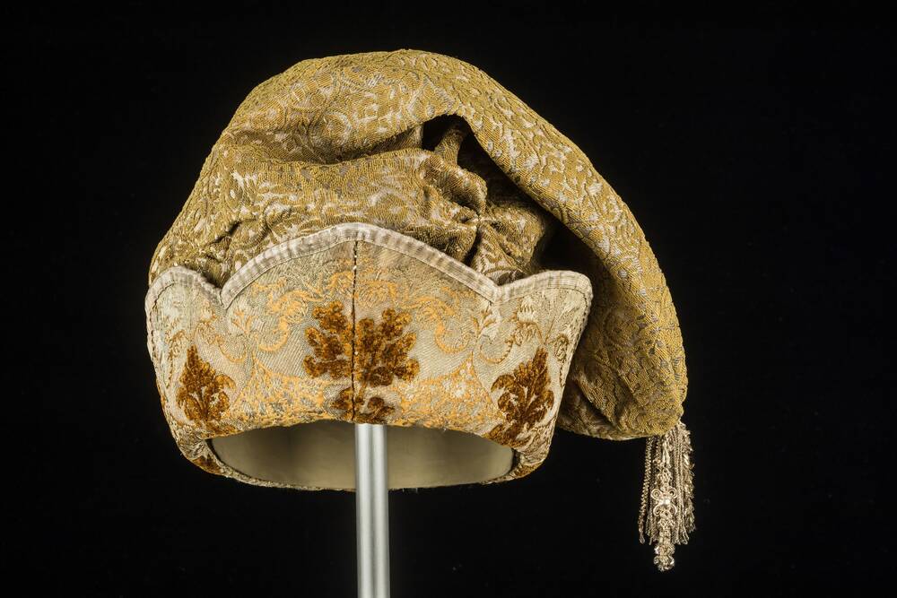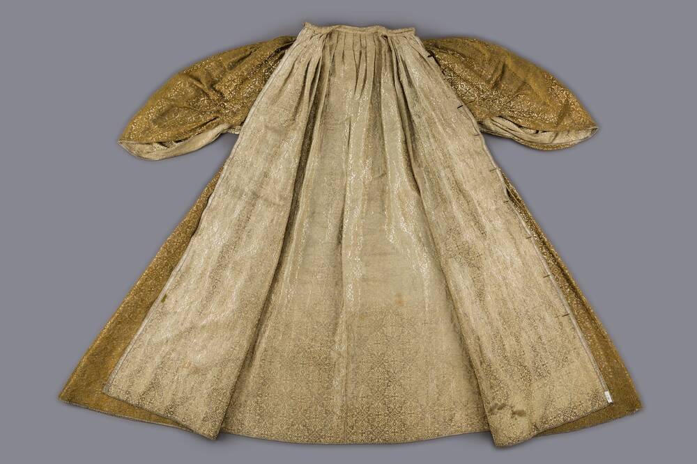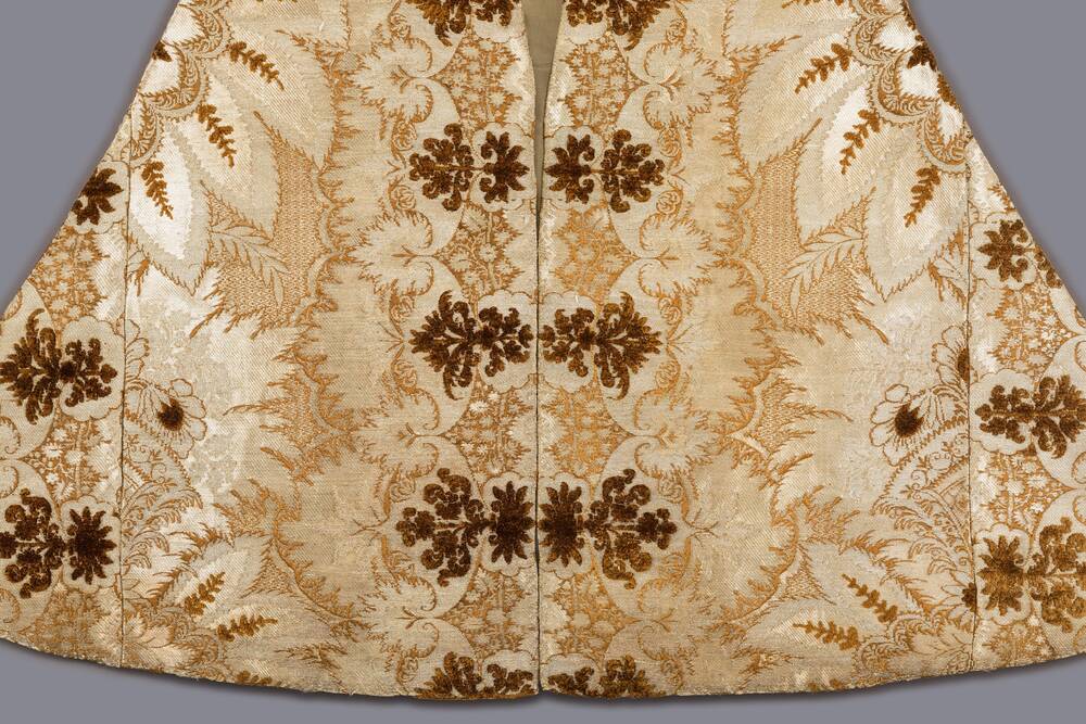 Der bodenlange Mantel und die Mütze mit hochgeschlagener Krempe, die an die polnische Tracht erinnert, sind aus „braunem Samt mit silbern Boden" gearbeitet und weisen das Ensemble als Hauskleid aus. Die knielange Weste folgt hingegen im Schnitt der unter einem Staatsrock getragenen Weste. Ein erlesener Stoff mit Spitzenmuster und zimtbraunen Blumen wurde für die Weste und Mützenkrempe ausgesucht.