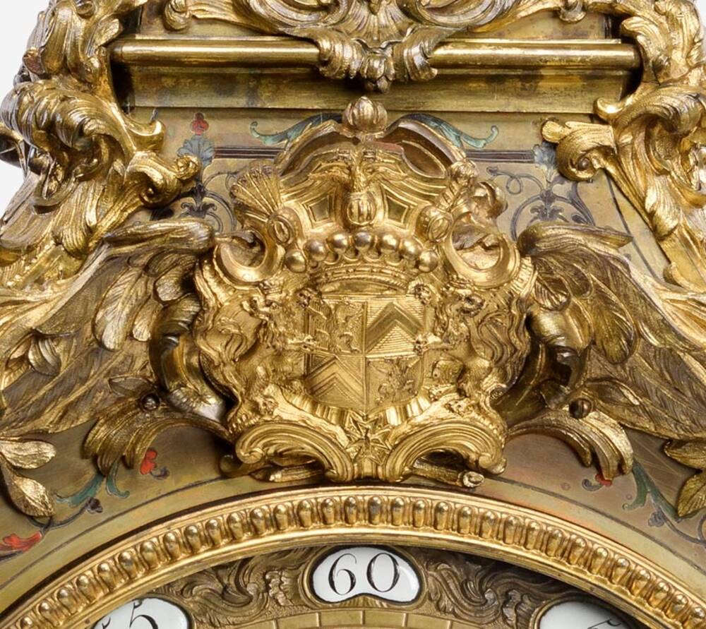 Eine relativ genaue Datierung der Ensembles und Hinweise zu deren Erwerbungszeitraum und -umstand ermöglichen das Wappen Brühls sowie die mit einem Stempel in Form eines bekrönten C versehenen Beschläge. Der sogenannte c-couronné Stempel war eine Steuermarke, die in Paris zwischen März 1745 und Februar 1749 in auf Gegenstände aus Kupferlegierungen aufgebracht wurde, wenn diese verkauft wurden, weshalb die Datierung auf diesen Zeitraum eingegrenzt werden. kann. Das am Scheitel der Pendule befindliche Wappen des Grafen Brühl wurde von ihm bis ca. 1748 verwendet, wodurch sich die Datierung weiter eingrenzen lässt. Zu vermuten ist, dass die Erwerbung im Zusammenhang mit seiner Ernennung zum Premierminister 1746 gestanden haben könnte, auch weil das zentrale Marketeriemotiv der Konsolen auf die Fähigkeiten des Staatsmannes Brühl hinweist.