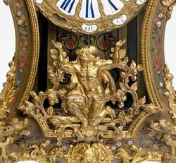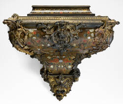 Die in Eiche gearbeiteten Korpusse der Pendulen und der Konsolen sind mit einer der außergewöhnlichsten polychromen Marketerien in contre partie beleg. Auch wenn die Marketerie viele Fehlstellen hat, bestechen die erhaltenen Ornamente durch ihre hervorragend gearbeiteten Gravuren. Die zarten Ornamentranken und Blüten der Marketerien der Pendulen sind aus vielfarbig hinterlegten Horneinlagen in Gelb, Orange, Rot sowie Blau, Grün und Türkis sowie silbrig-weiß reflektierend glänzendem Perlmutt gearbeitet.