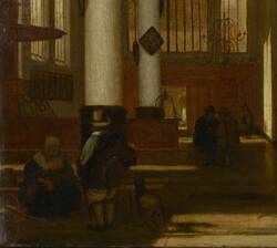 Emanuel de Witte (1617–1692) gehörte gemeinsam mit Gerard Houckgeest und Hendrik van Vliet zur sogenannten "Delfter Gruppe", die maßgeblich das Kircheninterieur als neue Bildgattung prägten. 1652 übersiedelte de Witte nach Amsterdam, wo vor allem die Oude Kerk, die wir hier sehen, ein wichtiger Bildraum für sein künstlerisches Schaffen wurde. In über 60 Gemälden malte er die Kirche aus unterschiedlichen Perspektiven. Ein wichtiges Element in dem Gemälde sind die transparenten Fensterflächen: Durch die leicht milchigen, aus vielzähligen Rauten bestehenden Glasscheiben ist schemenhaft ein Gebäude zu sehen, welches sich gegenüber der Kirche befindet. Durch die Transparenz der Fenster holt de Witte die Außenwelt in seine Innenraumdarstellung hinein und hebt so die Schranken zwischen dem heiligen und dem alltäglichen Raum auf.