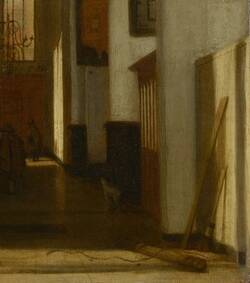 Die Verschränkung zwischen dem Sakralen und dem Profanen spiegelt sich auch in den Tätigkeiten der Menschen wider, die den Kirchenraum beleben: So flanieren im Hintergrund zwei Männer ruhig durch den Kirchenraum, während in der linken Bildhälfte eine Mutter ihr Kind in den Armen hält. Der Kehrbesen, der im goldenen Sonnenlicht an der Wand lehnt, verweist auf die alltäglichen Arbeiten des Kirchenaufsehers, sodass der Kirchenraum nicht nur als Ort der Kontemplation, sondern auch als Ort profaner Arbeit markiert wird. Ebenfalls findet sich bei de Witte das Motiv des Hundes in der Kirche wieder: Beide Tiere versinken halb im Schatten, der eine neben einer Säule in der rechten Bildhälfte, der andere zu Seiten der Familie links. Die verschiedenen Tätigkeiten, die de Witte in seinen Kircheninterieurs zeigt, spiegelt die vielfältigen gesellschaftlichen Funktionen wider, welche die niederländischen Kirchengebäude nach der Reformation als öffentlich verwaltete Einrichtungen übernahmen. Indem er den Kirchenraum durch die Transparenz der Fenster zum Außenraum öffnete, bekräftigte er den Weltbezug zur Kirche.