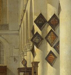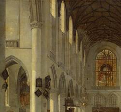 Job Adriaensz. Berckheyde (1630–1693) malte die große St. Bavokerk in Haarlem, die 1578 reformiert wurde, mehrfach und aus verschiedenen Perspektiven. Berckheyde wählte hier seinen Standort etwa in der Mitte des Chores, sodass der Blick durch Vierung und Langhaus bis zum imposanten Glasfenster an der Westfassade geht. Das von links einfallende Sonnenlicht streift die Säulen auf der Südseite, spielt auf den Messingleuchtern und der Gruppe der Zuhörer im Mittelschiff und erhellt die westliche Säulenreihe mit den markanten Wappenschildern.