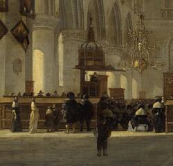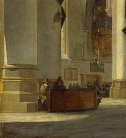 Der Kirchenraum ist belebt: Eine große, überwiegend in Schwarz gekleidete Menschenmenge lauscht der Predigt, die von der Kanzel verkündet wird. Auffällig ist der weitläufige Raum im Vordergrund, in dem sich einzelne Personen frei bewegen. Berckheyde wählt hier einen Betrachterstandpunkt, der die Unterscheidung zwischen preekkerk und wandelkerk deutlich macht. Im calvinistischen Glauben hat die Predigt eine besondere Bedeutung – die religiöse Gemeinschaft entsteht im gemeinsamen Moment des Hörens. Die preekkerk bezeichnet deshalb den Bereich, in dem die Zuhörer während der Predigt versammelt sind. Die wandelkerk hingegen diente als öffentlicher Raum, in dem Menschen umhergingen, sich unterhielten oder der Orgelmusik lauschten – unabhängig von ihrer Konfession. Beide Bereiche sind keineswegs statisch zu verstehen: Wenn viele Menschen zur Predigt kamen, wurde die preekkerk größer. Fand keine Predigt statt, wurde die gesamte Kirche zur wandelkerk.