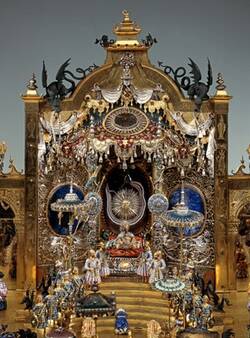 Eine schier unübersehbare Fülle von Details auf dieser fast ein Quadratmeter großen Architektur mit ihren drei Höfen erfreuen das Auge und regen die Phantasie an. 132 kleine Figuren agieren auf der aus Silber und vergoldetem Silber gefassten Bühne. Sie präsentieren 32 Geschenke – darunter einen weißen Elefanten, eine Sonnenpyramide, eine große Vase, eine Schatztruhe oder ein Kaffeeservice. Weit über 5000 Diamanten, Rubine, Smaragde und weitere Edelsteine wurden verarbeitet, knapp 400 davon sind im Lauf der Jahre verloren gegangen. Alle Figuren lassen sich frei bewegen und konnten so individuell kombiniert werden. Je nach Konstellation konnte man so immer neue Aussagen erzielen. Wir haben aber auch Anhaltspunkte für die damalige Aufstellung, so eine Beschreibung von Johann Melchior Dinglinger und einen Stich aus dem Jahr 1739.
