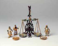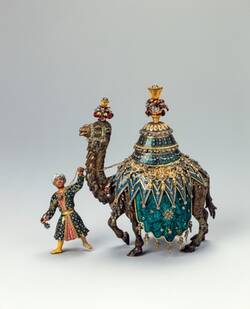 - Holzkern, Gold, Silber, teilweise vergoldet, Email, Edelsteine, Perlen, Lackmalerei, Tisch: Holz, vergoldet