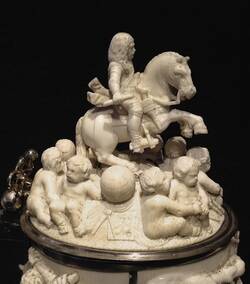 „Sächsischer Mars“ – so lautet ein Beiname Kurfürst Johann Georgs III., den der Herrscher besonders schätzte. Beim Entsatz von Wien 1683 hatte er die kursächsischen Truppen erfolgreich gegen die osmanischen Belagerer geführt. Der imposante Humpen erinnert an sein Kriegsglück. In der Elfenbeinschnitzerei am Korpus verschmilzt der mythische Kampf gegen die wilden Kentauren mit dem siegreichen Feldzug des „Mars saxonicus“ gegen die Osmanen.