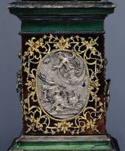 - Elfenbein, Säule: Holz mit Farbfassung, Schildpatt, Silber, teilweise vergoldet