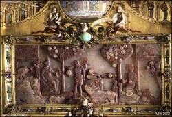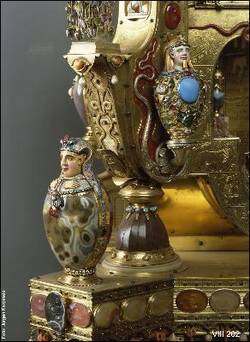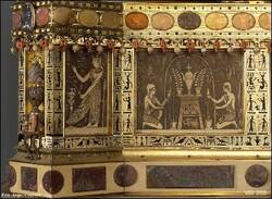 Der Blick gleitet weiter nach oben zu einem großen Edelsteinrelief, bestehend aus drei Chalcedon-Tafeln mit erhaben gearbeiteter Darstellung. Die Szene dort schildert, wie der hundeköpfige Gott Osiris durch seine Gattin Isis und andere Götter verehrt wird. Das große Rundmedaillon darüber zeigt die Verklärung des göttlichen Paares Isis und Osiris mit ihrem Kind Horus.