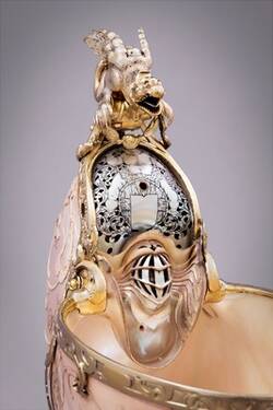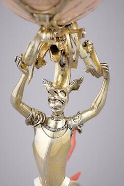 Johann Heinrich Köhler, neben Johann Melchior Dinglinger der meistbeschäftigte Goldschmied und Juwelier am Dresdner Hof, hat dieses originelle Gefäß aus verschiedenen Resten der Dresdner Schatzkammer geschaffen. August der Starke hatte seinen Hofjuwelier 1724 mit der Sichtung des historischen Sammlungsbestandes beauftragt. In kürzester Zeit restaurierte Köhler mit acht Mitarbeitern 155 Kunstwerke für das zukünftige Schatzkammermuseum.
