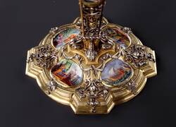 Die Goldschmiedefassung der Figur stammt von Johann Melchior Dinglinger, die Emailmalerei am Schaft und Fuß der Schale von seinem Bruder Georg Friedrich. Die kleinen Medaillons zeigen Szenen der griechischen Argonautensage. Um 1709, als diese Prunkschale entstand, war die Erzählung, in deren Verlauf der Argonaut Jason mit Hilfe der Zauberin Medea das goldene Vlies nach Griechenland entführt, hochaktuell. Hintergrund war ein Besuch des Königs Frederik IV. von Dänemark in Dresden. August der Starke versuchte, seinen Vetter im Rahmen aufwendiger Feste für einen erneuten Zusammenschluß gegen Schweden zu gewinnen. Zahlreiche Verweise an den dänischen König, in einer Allianz die Position Augusts des Starken zu stärken, finden sich in diesem Kunstwerk. So auch der kleine weißemaillierte Elefant, den der Drache oben auf dem Schalenwirbel präsentiert – das Kleinod des dänischen Elefantenordens. August der Starke, über seine Mutter mit dem dänischen Königshaus verwandt, war Ritter dieses Ordens und trug sein Kleinod zu „besonderen Anlässen“.