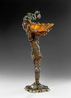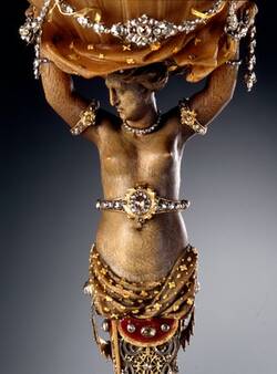 Die Herme ist aus einem einzigen Stück kostbaren Rhinoceroshorns von Benjamin Thomae geschnitzt. Auf ihrem Kopf trägt sie eine kammmuschelartige Schale aus dem gleichen Material. Diamantbesetzte Silbergirlanden sind an ihr befestigt.