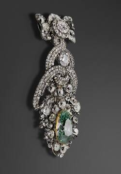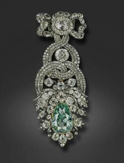 - mandelförmiger "seladongrüner" Diamant von 160 Grän (41 Karat), darüber runder Brillant von 24 1/2 Grän (6,28 Karat), oben runder Brillant, 411 mittelgroße bis kleine Brillanten, Gold, Silber