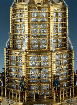 So ähnlich mag die Musik geklungen haben, die das kleine Orchester auf der unteren Balustrade dieser Kugellaufruhr einst gespielt hat. Dieses prachtvolle Gebilde, das Kurfürst Christian der Zweite 1603 seiner Gemahlin Hedwig schenkte, ist ein Meisterwerk der Uhrmacherkunst, und es war zugleich eine der ersten Maschinen, die Musik mechanisch reproduzieren konnte. Kugellaufuhr heißt sie deshalb, weil genau einmal in der Minute eine Bergkristallkugel eine schräge Bahn von 16 Windungen hinab läuft, während ein Hebewerk im Inneren eine zweite Kugel emporhebt.