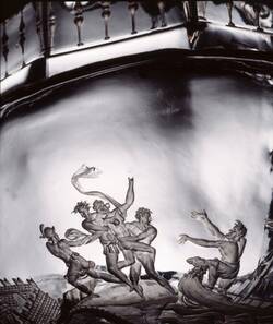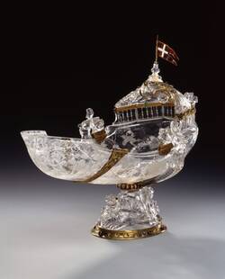 Die prächtige Galeere aus Bergkristall entstand zu Ende des 16. Jahrhunderts in der berühmten Werkstatt der Familie Saracchi in Mailand. Der Schiffskörper ist mit präzis und zart geschnittenen Szenen aus der griechischen Sagenwelt verziert. Der Raub der Europa, die Befreiung der Andromeda durch Perseus, die Entführung der Helena und schließlich die Belagerung Trojas. In Mailand erhielt die Galeere ihre kostbare Fassung.