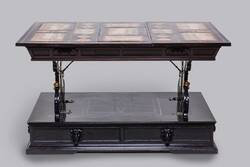 - Blindholz in Fichte, Platte in Ebenholz furniert mit Königholzbändern, Zinnadern und 31 verschieden großen Platten in Ruinenmarmor (Florentiner Marmor); Sockelkasten und Wangen in massiv schwarz gefärbtem Birnbaum, teilweise in verschiedenen Hölzern furniert, Elfenbeinadern; roter Samt mit Silberborten; Blattvergoldungen; Eisenbeschläge graviert, äthervergoldet, gebläut. Instrumente und Gegenstände aus verschiedensten Materialien.