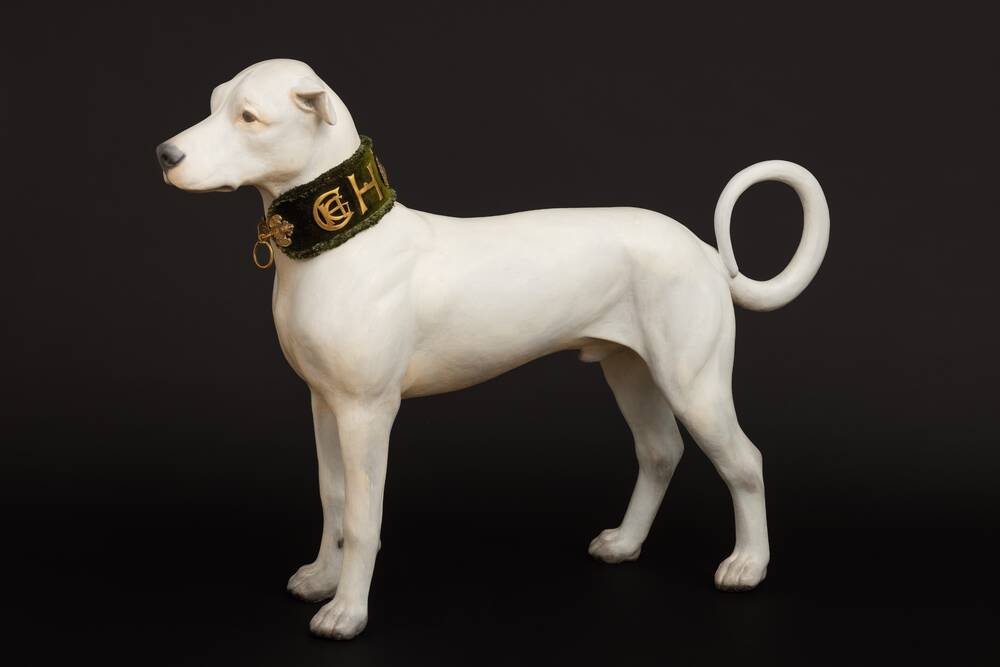 Ein zierlicher Windhund hatte ein anderes Halsband als ein winziger Schoßhund. Aber notiert wurden die Hunde nur sehr selten. Es gibt zum Beispiel ein großes Halsband mit den Buchstaben IG darauf, das für den Leibhund des Kurfürsten Johann Georg I. hergestellt wurde. Wie der Hund aussah, ist nicht bekannt, aber es dürfte eines der gewaltigen Tiere gewesen sein, mit denen sich der Kurfürst gelegentlich abbilden ließ. Ähnlich, wie der geschnitzte Hund auf dem Podest in der Raummitte.
