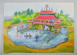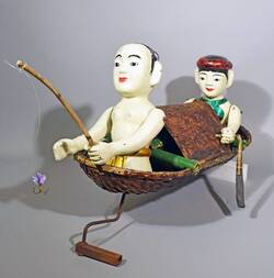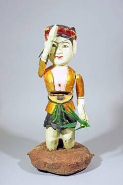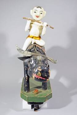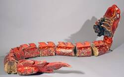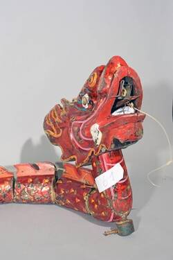 Der Drache, ein zentrales Symbol im Wassermarionettentheater, steht in Vietnam für Macht und Stärke, aber auch Wohlstand und Glück. Der hier ausgestellte Drache beeindruckt durch seinen guten Erhaltungszustand. Sein Körper ist aus Holz geschnitzt und besteht aus neun beweglichen, rot gefassten Gliedern mit goldgelbem Schuppenmuster. Diese Konstruktion verleiht ihm eine bemerkenswerte Beweglichkeit, die das Spiel lebendig und dynamisch macht.