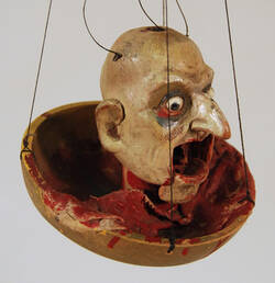 Vor Dir siehst Du den abgeschlagenen Kopf des Hakim, ein zentraler Bestandteil aus dem Stück „Die Rache des Hakim“ von Ivo Puhonny (1876-1940). Der Werbegrafiker und Puppengestalter schuf diese Figur für sein 1911 gegründetes „Baden-Badener Künstler-Marionettentheater“. Die Figuren wurden von Ivo Puhonny selbst gestaltet und geschnitzt, während seine Frau Linda die Kostüme entwarf. Für die Aufführungen überließ Puhonny das Spiel mit den Marionetten professionellen Puppen- und Schauspieler*innen, die die Produktionen in Deutschland, Europa und weltweit präsentierten.