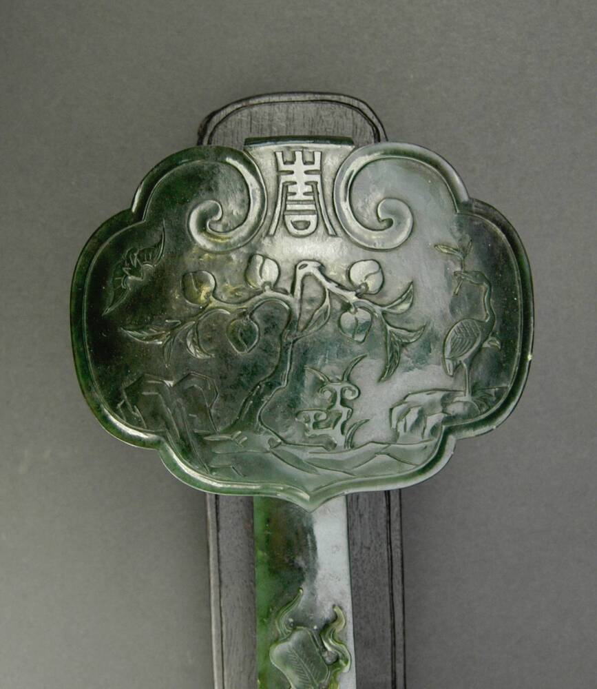 Die als stilisierte Wolke gearbeitete Kopfplatte des dunkelgrünem Nephrit-Wunschzepters zeigt im Relief Symbole der Langlebigkeit, wie das Zeichen shou, Kranich und Feld sowie den lingzhi-(fungus) Pilz, die Glücksfledermaus fu und den Pfirsich als Aphrodisiakum. Hochreliefs auf dem Zepterstiel stellen die Attribute der Acht Unsterblichen baxian ren des Daoismus dar. Das Wunschzepter gelangte 1875 durch den Ankauf der ethnographischen Sammlung von Carl Friedrich Pieschel, der 1860-61 als Legationssekretär die diplomatische Gesandtschaft Preußens (Eulenburg-Expedition) begleitet hatte, an das neu begründete Museum für Völkerkunde in Dresden.