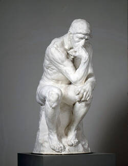 Still und bewegungslos sitzt der Mann auf dem Felsen. Er grübelt. Arme und Beine sind muskelbepackt – vielleicht ist er ein Tatmensch, ein Kämpfer, ein Held gar. Doch warum hat er sich niedergesetzt, worüber grübelt er, und – wer ist er eigentlich? Der Titel der Skulptur gibt darüber keinen Aufschluss. Der französische Bildhauer Auguste Rodin nannte sein Werk „Der Denker“. Der Titel beschreibt also auch nur, was wir selbst sehen.