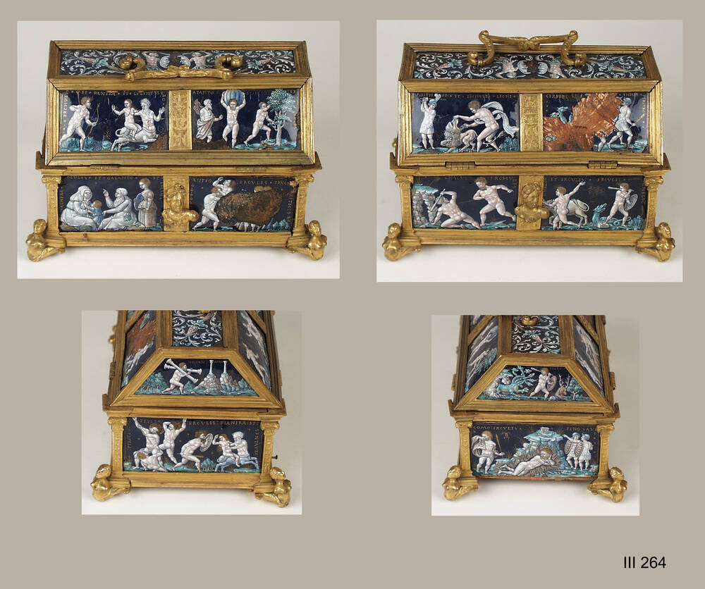 Dieses kleine Kästchen erzählt ein ganzes Heldenleben! Von der Geburt des Halbgottes, den die Griechen Herakles und die Römer Herkules nannten bis zu seinem Tod. Wir sehen vier seiner legendären Arbeiten und sieben andere Episoden – die prächtigen Email-Tafeln präsentieren ein Best-Of der Abenteuer unseres Helden, und sie lesen sich wie ein wildbewegtes Bilderbuch: Herkules kämpft mit der neunköpfigen Hydra, dem Nemeischen Löwen, er trägt die Weltkugel, während Atlas die Äpfel der Hesperiden stiehlt und schließlich stirbt er im Nessoshemd auf dem Berg Oeta.