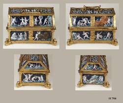 Das Kästchen ist etwa 500 Jahre alt und stammt aus dem südwestfranzösischen Limoges – damals das unangefochtene Zentrum der europäischen Emailkunst. Seine 13 Tafeln werden von einer vergoldeten Messingmontierung gehalten, die ebenfalls einen reichen Bildschmuck aufweist. Vier weibliche Genien halten es an den Ecken.