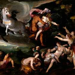 Ovid schilderte in seinen Metamorphosen die Entführung der Proserpina durch den in wilder Liebe entbrannten Pluto. In starker Untersicht gezeigt, jagen vier Pferde mit dem Wagen durch den Himmel.