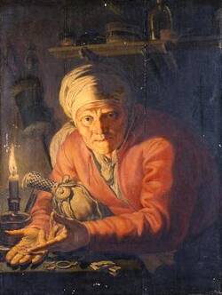 Im warmen Schein einer Kerze sitzt eine alte Frau an einem Tisch und zählt die Goldmünzen in ihrer Hand. Das Licht der Flamme fällt auf das faltige, vom Leben gezeichnete Gesicht, das der niederländische Maler Abraham Bloemaert in genrehaft-realistischer Art und Weise in Szene setzt. Der prall gefüllte Goldbeutel unter ihrem Arm verweist auf Avaritia, die Todsünde der Habgier. Durch die nahsichtige und prägnante Wiedergabe der Figur steigert Bloemaert die Deutlichkeit des Sujets. Die sich weit nach vorne lehnende Alte richtet ihren bohrenden Blick direkt auf den Betrachter und scheint so an die Vergänglichkeit des Seins und die Vergeblichkeit des Hortens von irdischen Gütern gemahnen zu wollen.